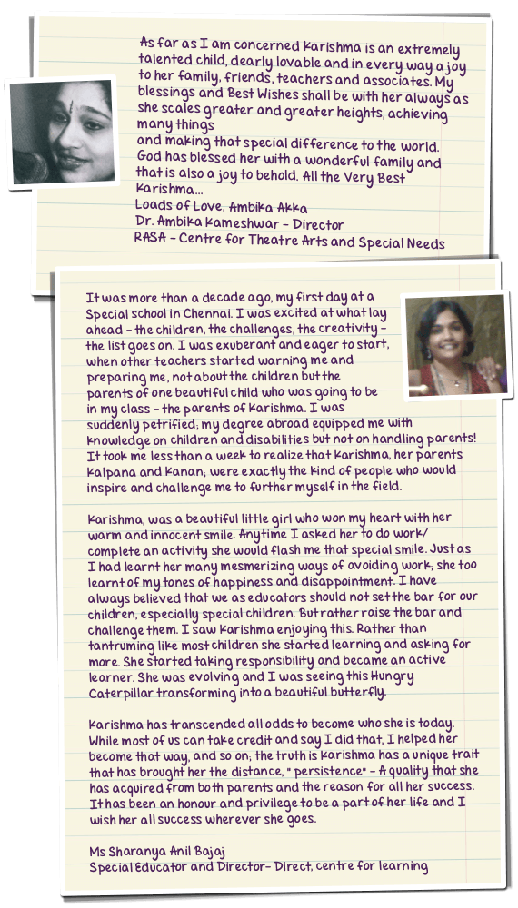Karishma seemed ready for more changes and the family discovered her interests in Dance and Theater Arts. Karishma found her expression through Classical Dance and Dance-drama organized by her special school-‘Rasa’. She was introduced to Creative Movement Education and enjoyed giving stage performances. The special school also prepared her for pre-vocational skills like block printing, paper-bags making and embroidery. Her parents enrolled her in after-school programs. ‘Individualized Educational program’ on one-to-one basis was introduced to her by a centre called ‘Direct’ where she was able to explore her computer skills, basic functional academics and cognitive abilities. She was also briefly introduced to key-board lessons as she enjoyed music but found it difficult to cope with the complexities of reading/understanding notes and using her fingers on the key board simultaneously. Karishma developed her self-help skills and domestic skills at this stage. The family provided her appropriate structure and routine in which she could independently operate with minimum help and this helped in building her self confidence. She got an opportunity to be the brand ambassador of an NGO, Shakthi Foundation, working for the betterment of special needs people. Her exposure to a larger audience, News and media worked as a positive reinforcement and she felt motivated to give her best.