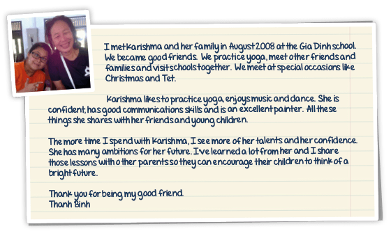 Music, bowling and travelling are amongst her other favorite hobbies and the family encourage her by participating and dedicating lot of time for the same. Karishma has been lately learning key-board. She has already travelled to 9 different countries with her family and she looks forward to traveling more in the future. She likes to assume certain responsibilities and has learnt to independently care for herself. Although Karishma has found very good friends in her teachers, she is still struggling to find friends of her age. Language constraints pose a major challenge. Karishma is comfortable speaking in English and a few Indian languages.Vietnamese is predominantly used in Vietnam for communication. Karishma is learning to deal with the absence of her sister Kajol since she moved to university in Australia in 2012, and looks forward to their holidays together. New addition in the family- a pet dog- Bonbon, received good care and attention from Karishma!