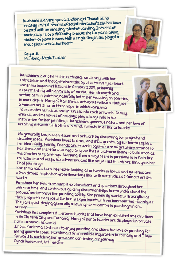 When we relocated to Vietnam, Karishma could not attend Special schools due to language constraints. The absence of formal schooling facility encouraged us to explore many other alternate avenues. She spent some time experimenting with pottery, gardening and weaving. She was lucky to meet the right people at the right time! A chance meeting with Ms Cyndi Beaumont, art teacher from UK, proved to be a turning point in Karishma’s life at this stage. There was an instant connecting and although Ms Cyndi had no formal exposure in working with special needs people, she happened to be the perfect teacher for Karishma. Ms Cyndi worked with Karishma on one to one, and the beautiful world of colors and imaginations, variety of mediums and techniques caught Karishma’s interest. Her attention span increased remarkably. A special bonding developed between Ms Cyndi and her student leading her to find her self expression through her paintings. It was a delight watching them work together, indoors and some times outdoors as well. As a family we supported and encouraged her every stage of involvement by participating with her in every way.